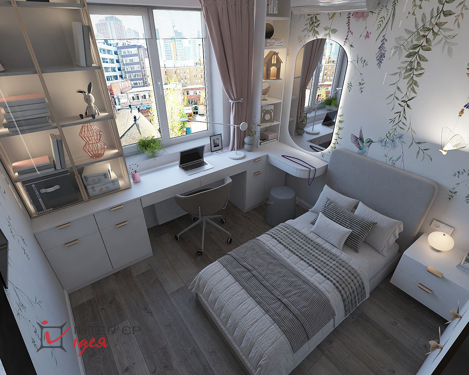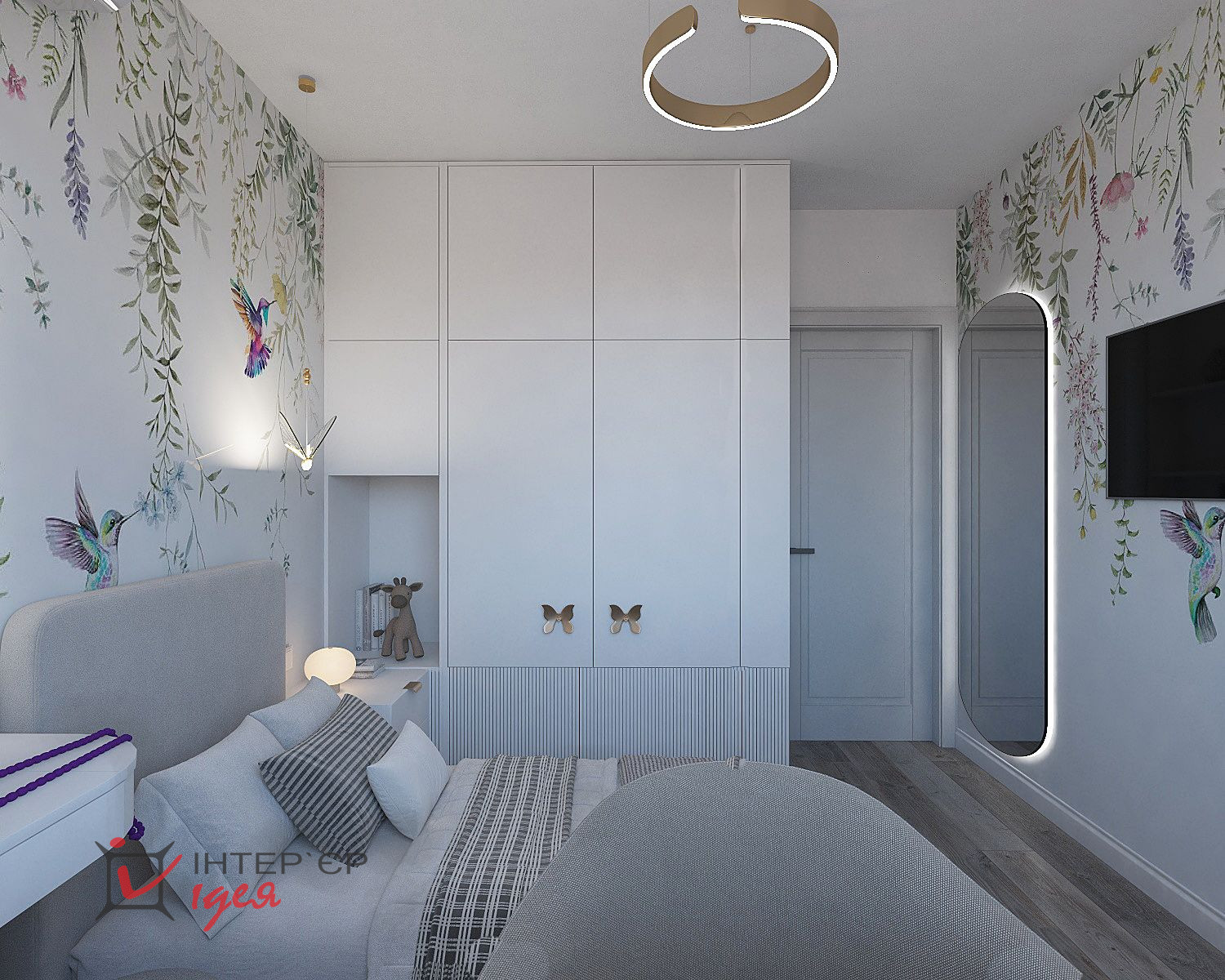 Основным оттенком выбран белый, который расширяет пространство и наполняет его светом. Акцентом стали обои с цветами и птицами — они вносят в интерьер деликатные краски и создают настроение лёгкости.