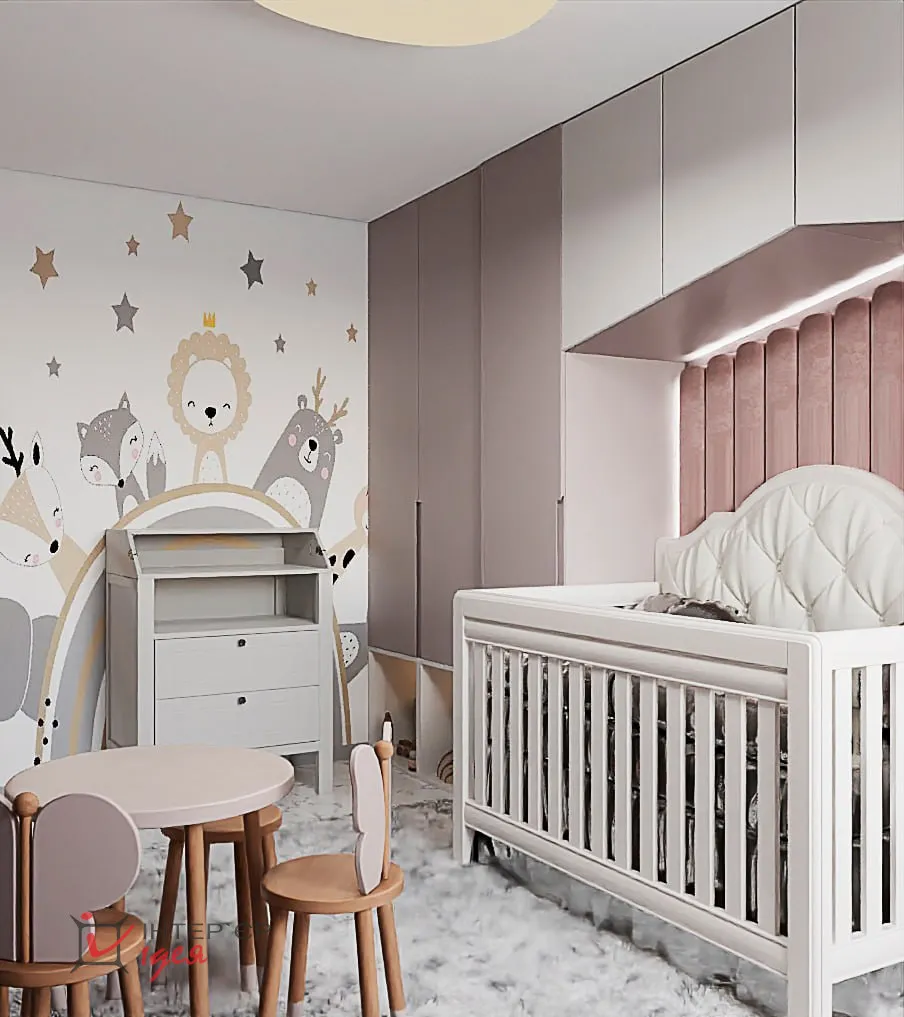В предложении учитывались возрастные изменения, ведь со временем часть мебели останется, а детская кроватка, пелинальный комод заменится на большую мебель. Добавили рабочий стол для обучения.