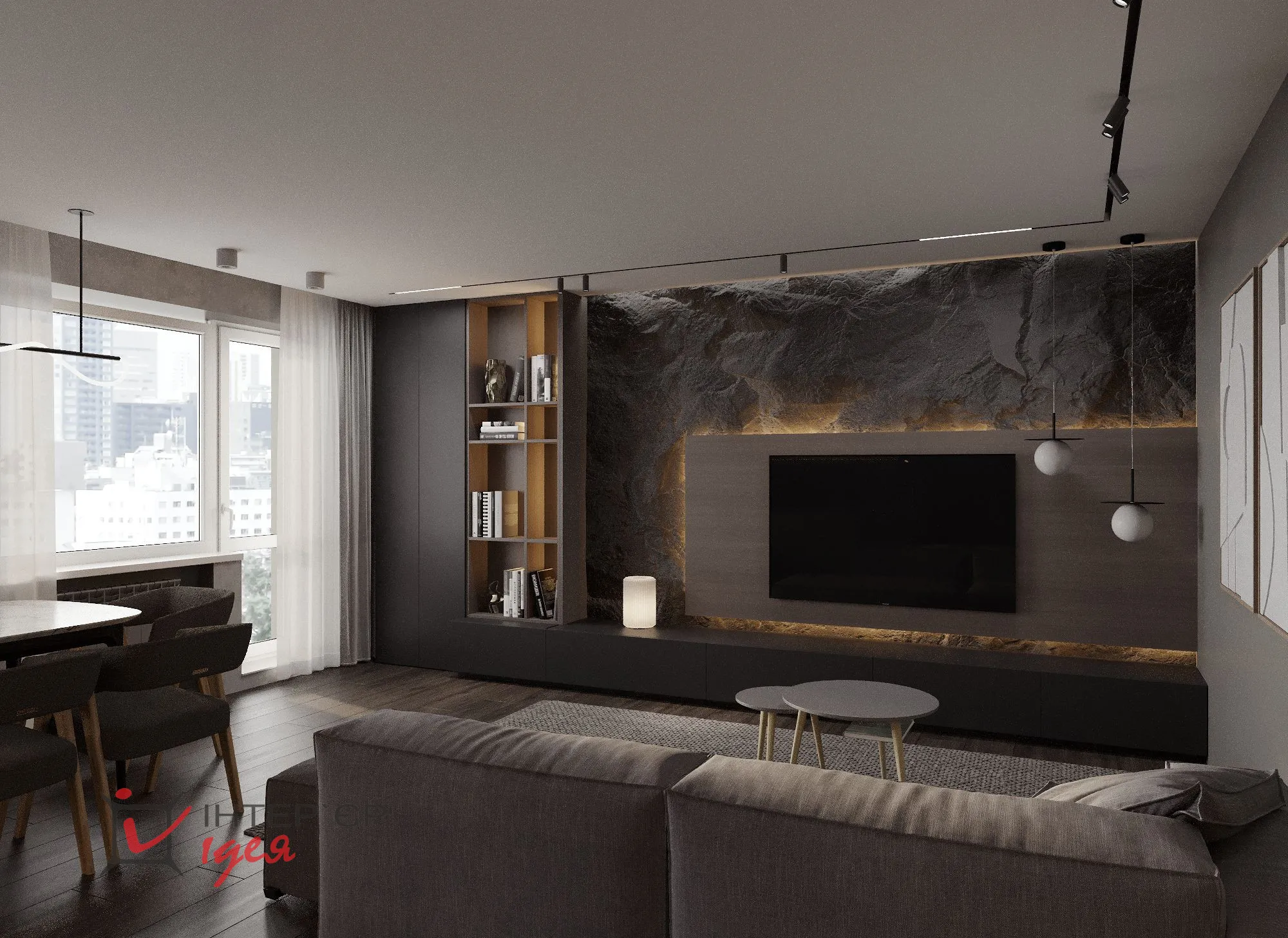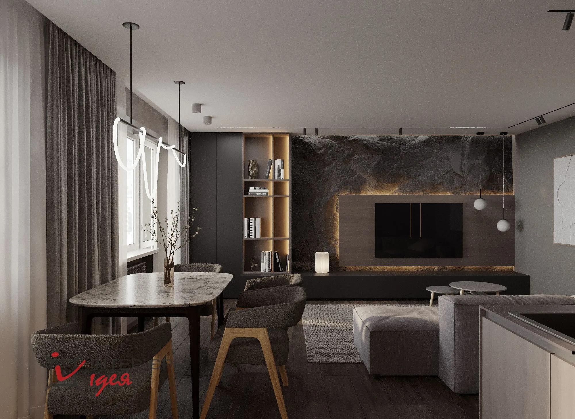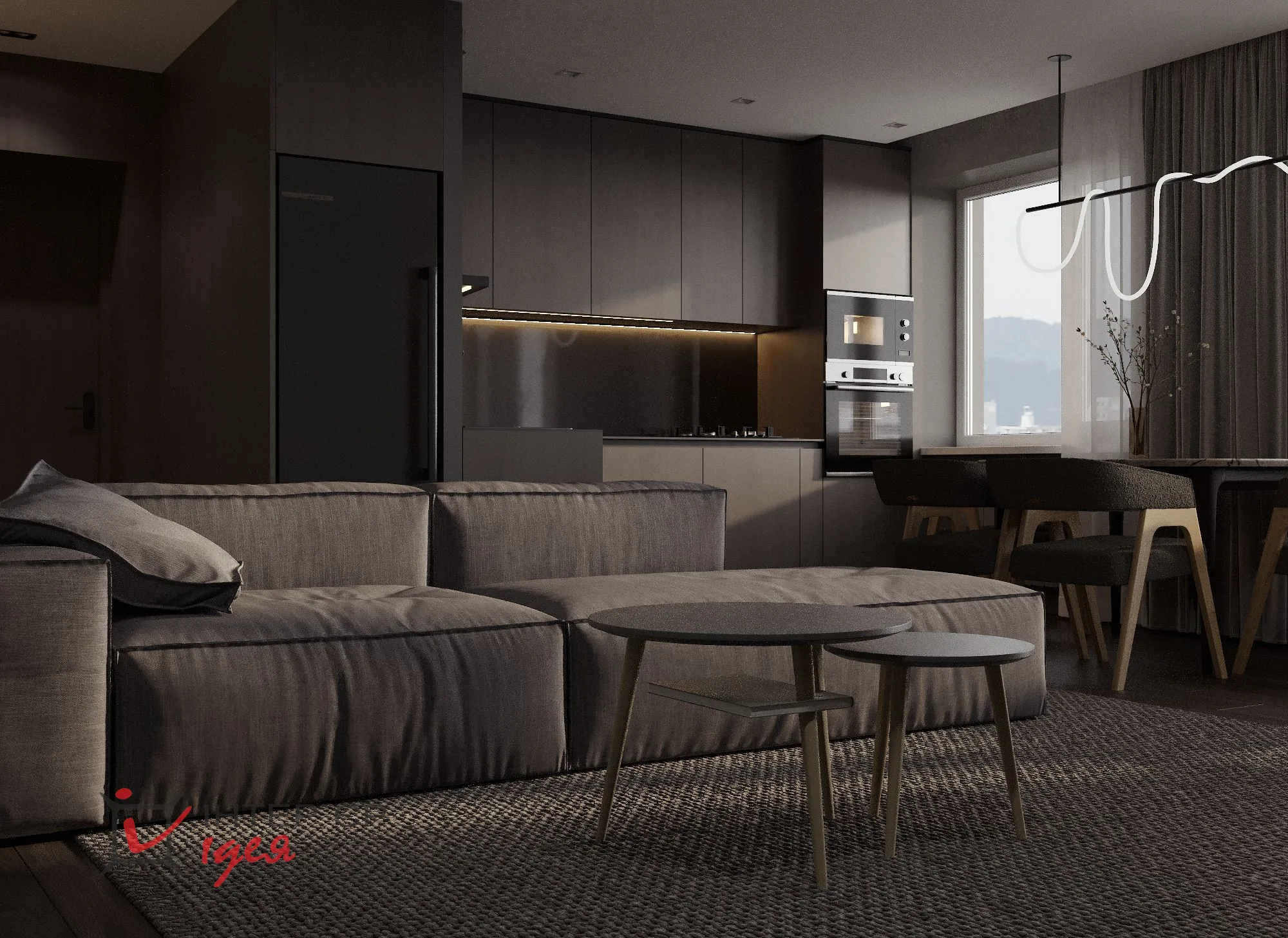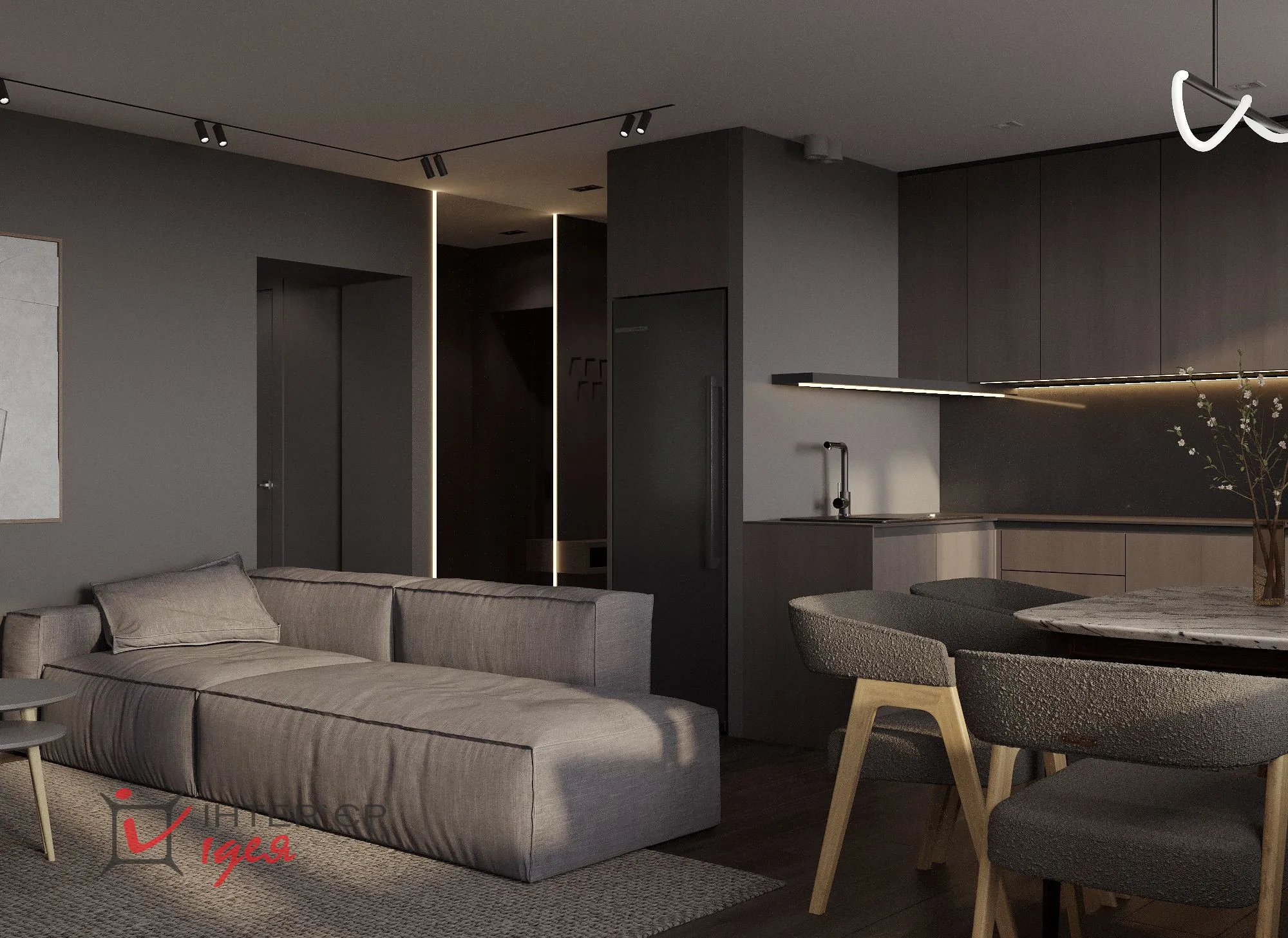 Темные тона – от глубокого графитового до насыщенного черного – присутствуют во всех комнатах, формируя глубину и добавляя драматизма дизайну. Мебель минималистичная и лаконичная: низкий серый диван и журнальный столик с деревянными деталями. Освещение создает уютную атмосферу за счет сочетания разных типов светильников и мягкого рассеянного света, подчеркивающего текстуры стен и текстиль.