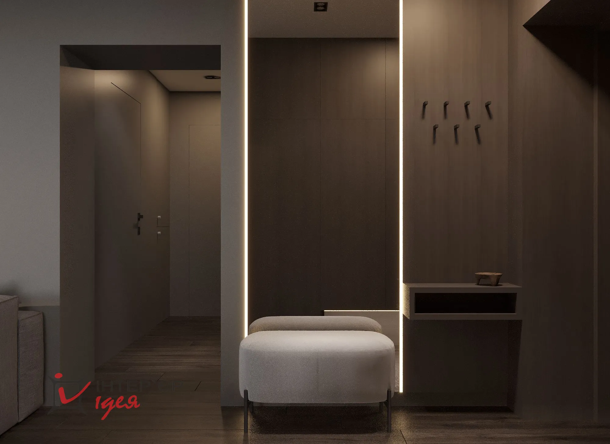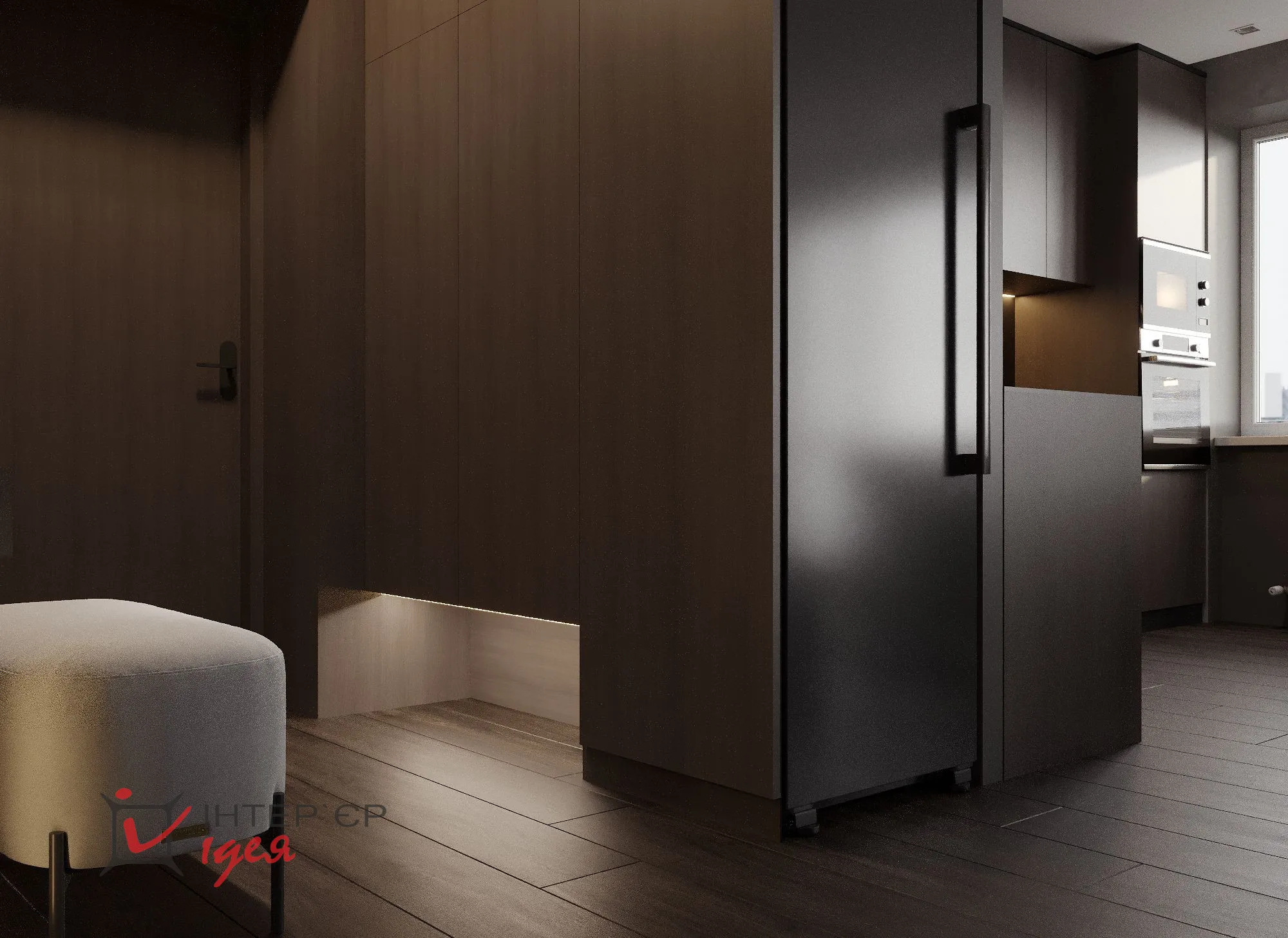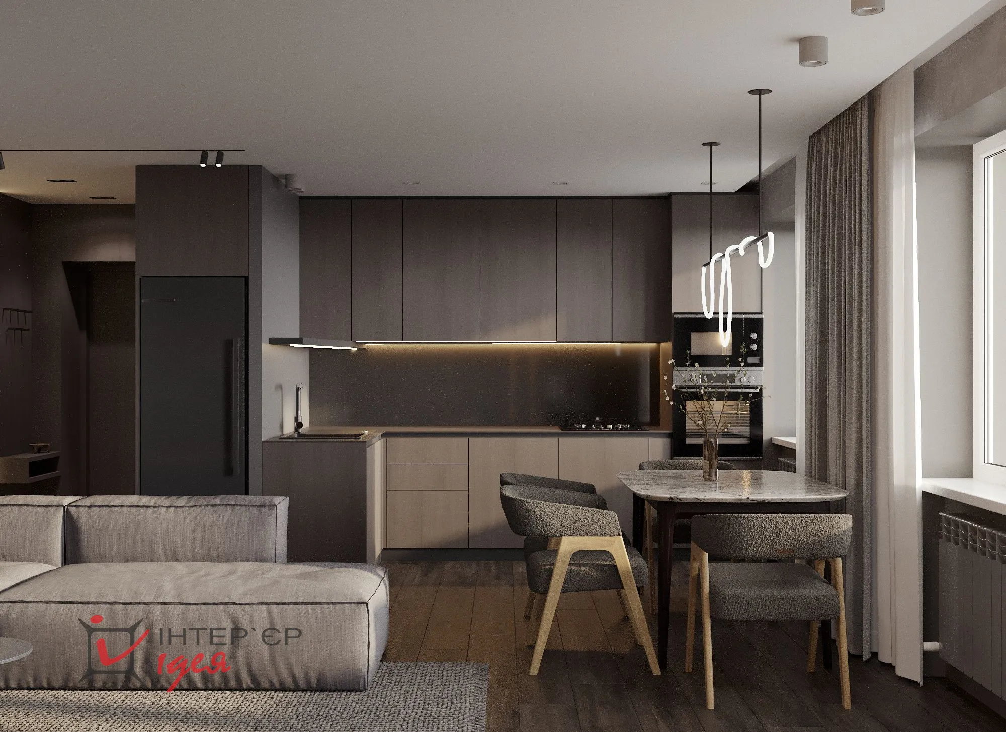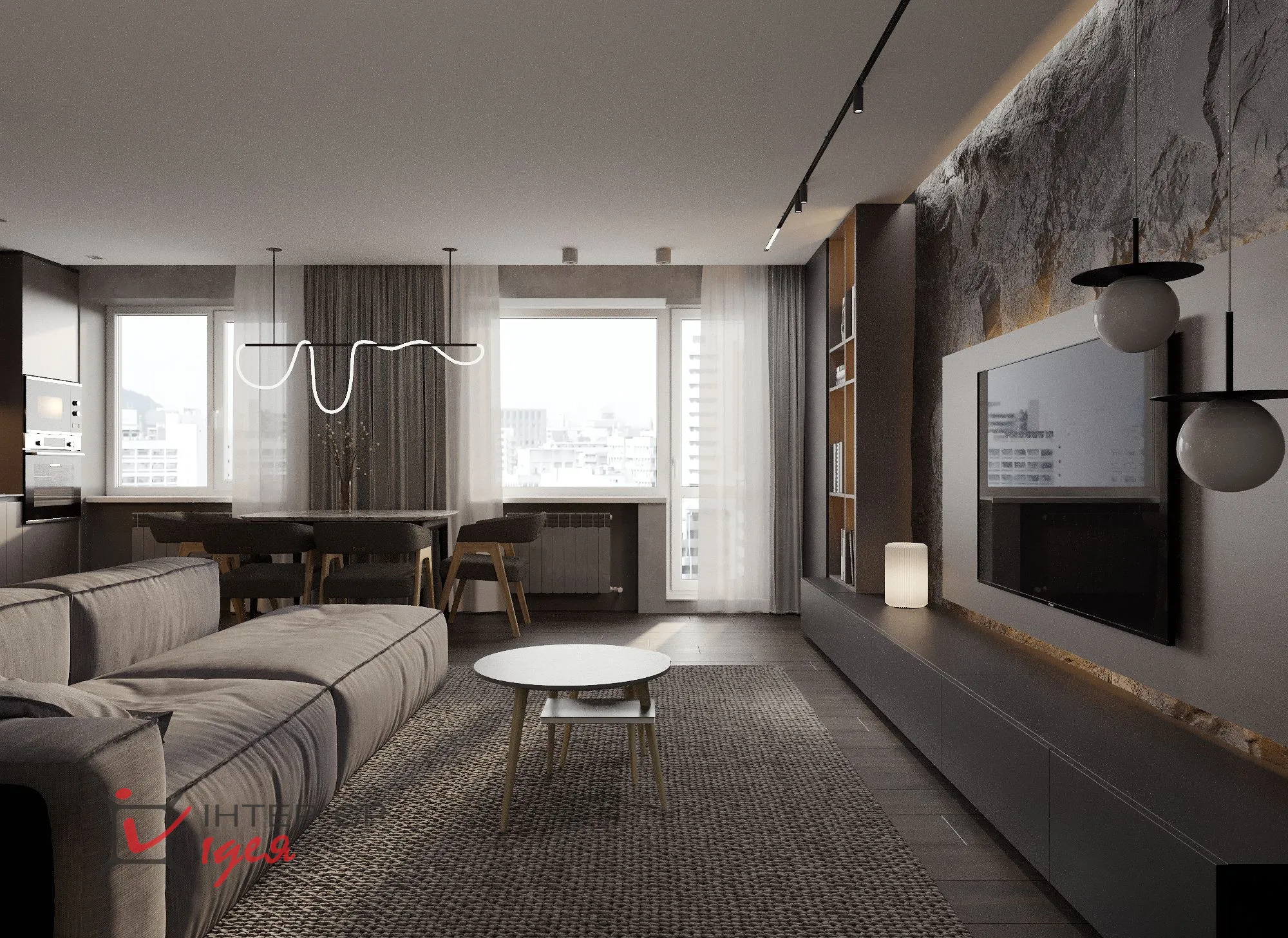 Темные тона – от глубокого графитового до насыщенного черного – присутствуют во всех комнатах, формируя глубину и добавляя драматизма дизайну. Мебель минималистичная и лаконичная: низкий серый диван и журнальный столик с деревянными деталями. Освещение создает уютную атмосферу за счет сочетания разных типов светильников и мягкого рассеянного света, подчеркивающего текстуры стен и текстиль.