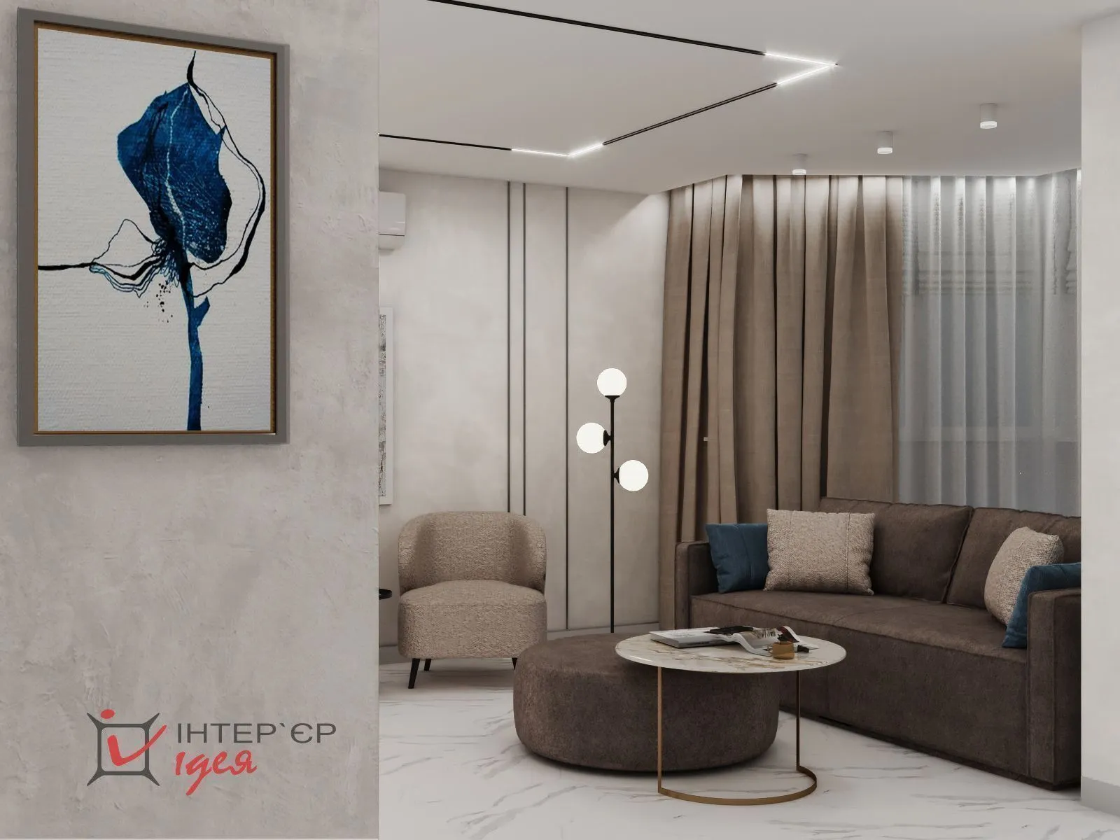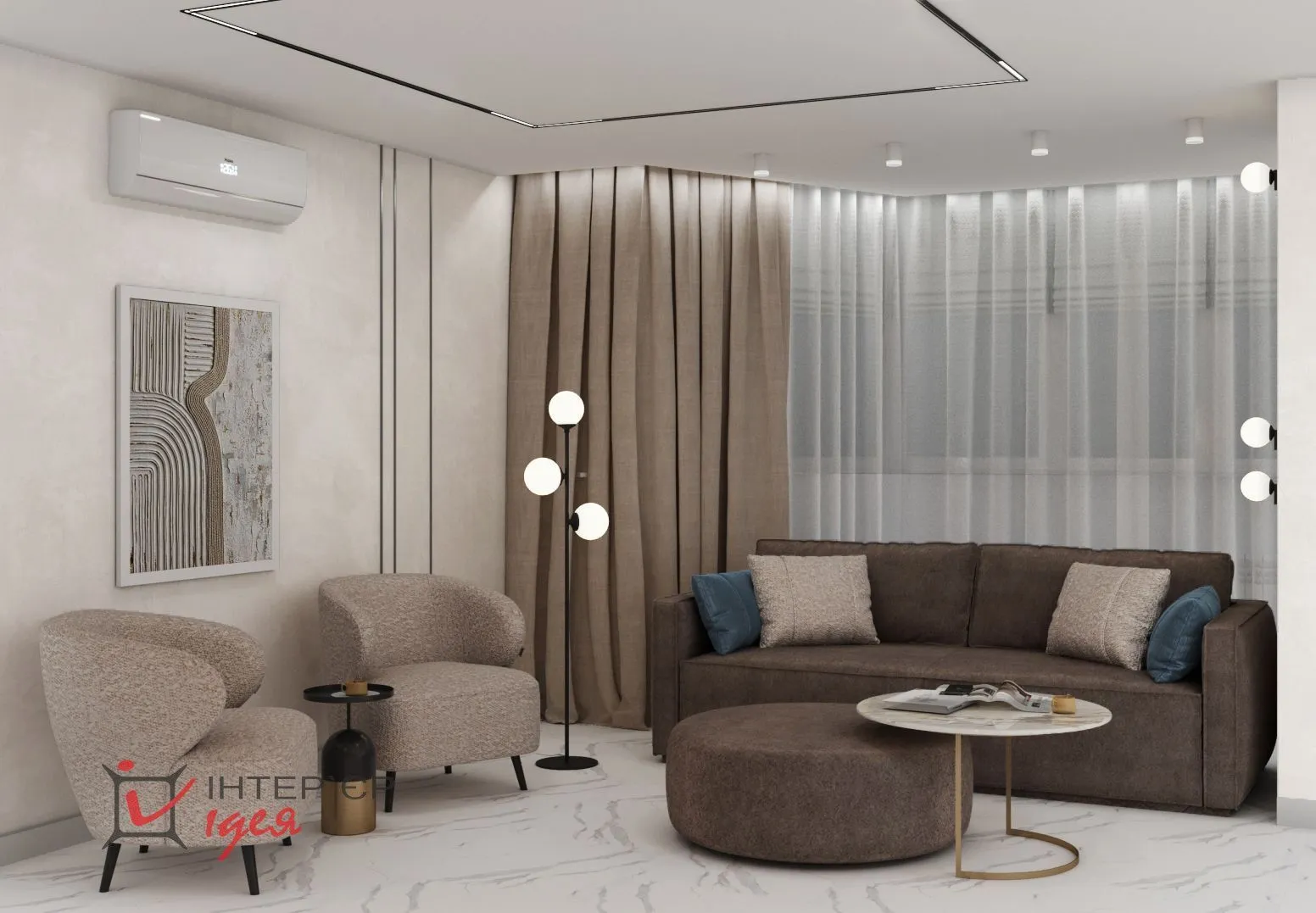 Разнообразие использованных текстур делают пространство визуально интересным и заполненным.