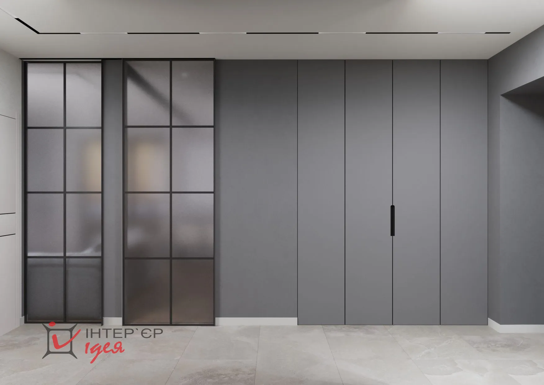 Прихожая имеет две панорамные стеклянные перегодки - раздвижные двери и стационарную перегододку, за счет чего свет из окон смежной комнаты будет попадать в помещение и дополнительно его освещать.