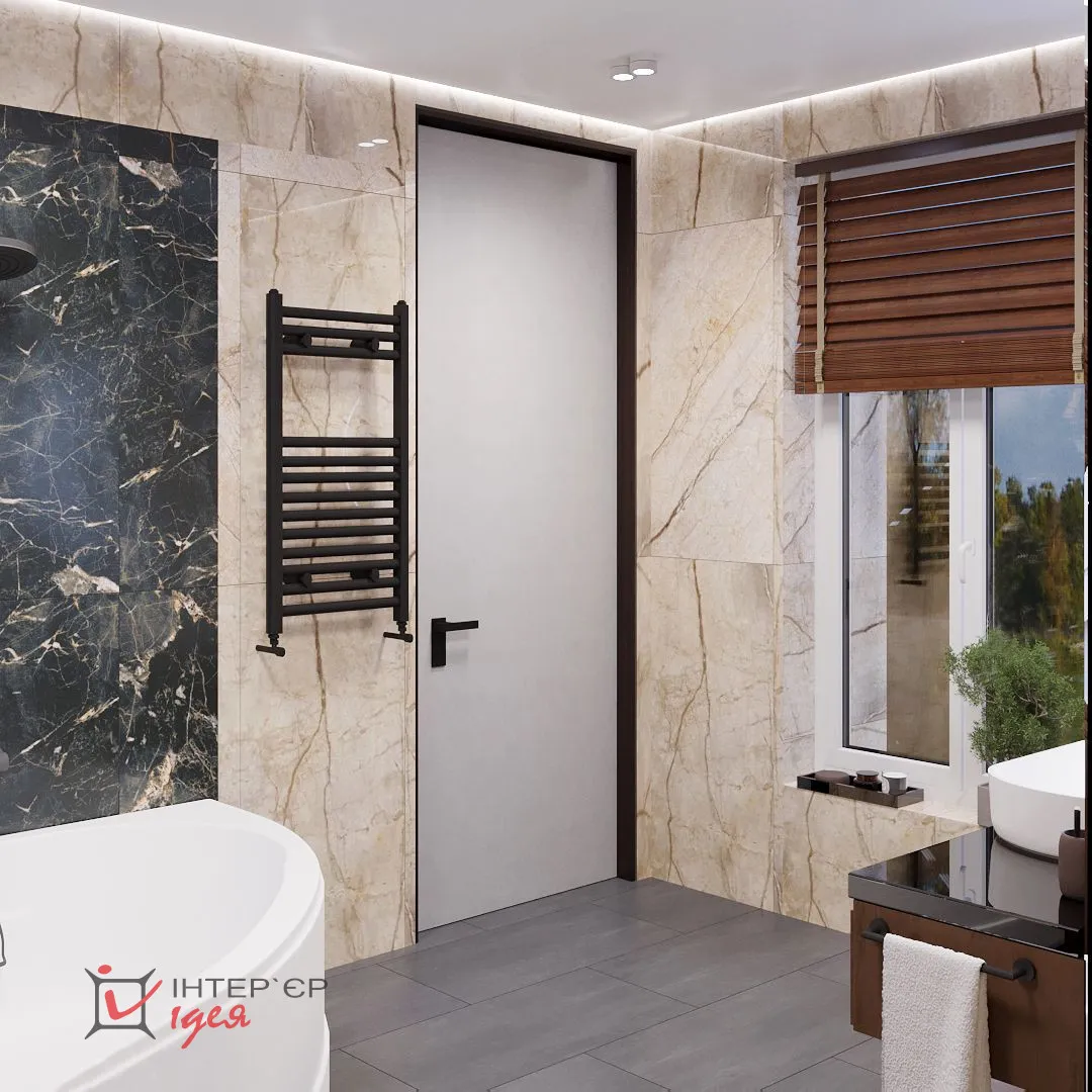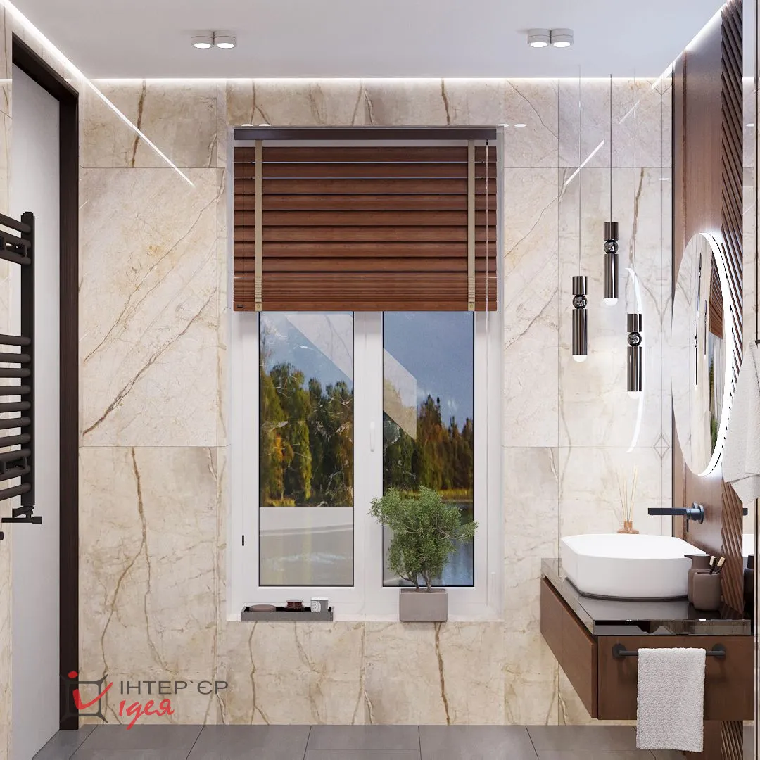 В этом санузле находится окно, которое днем обеспечит естественное освещение, а в вечернее время помогут деревянные жалюзи.