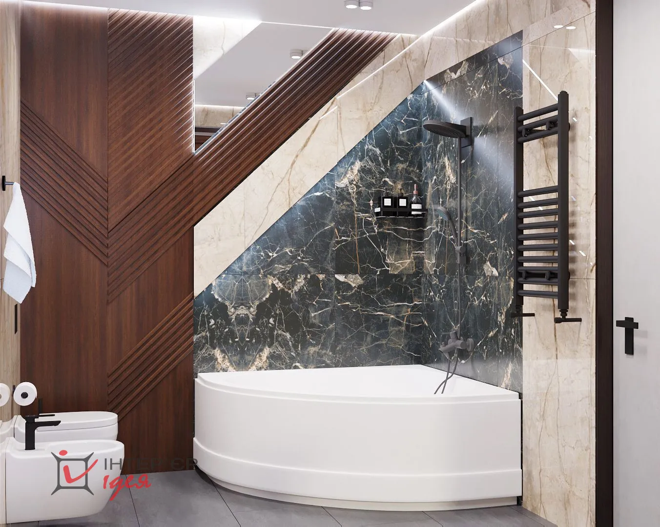 Для оформления стены в зоне угловой ванны дополнительно использован керамогранит черного цвета с песочными разводами. Рядом стена украшена деревянными панелями с зеркальной вставкой. Это делает интерьер интересным и динамичным.