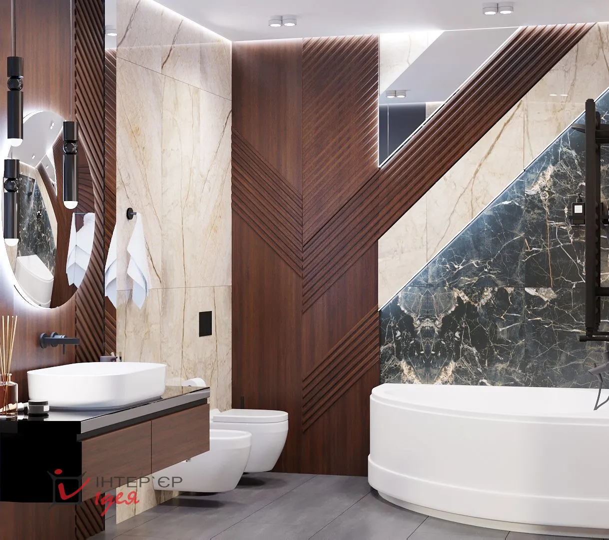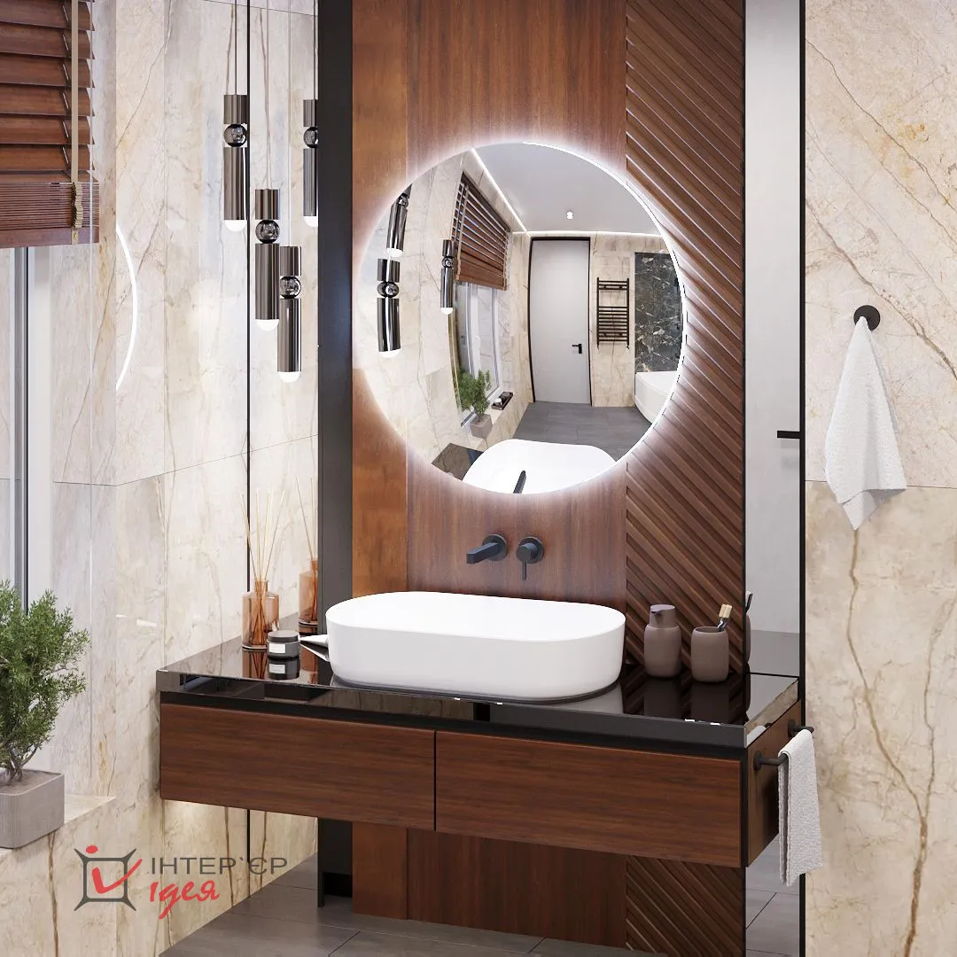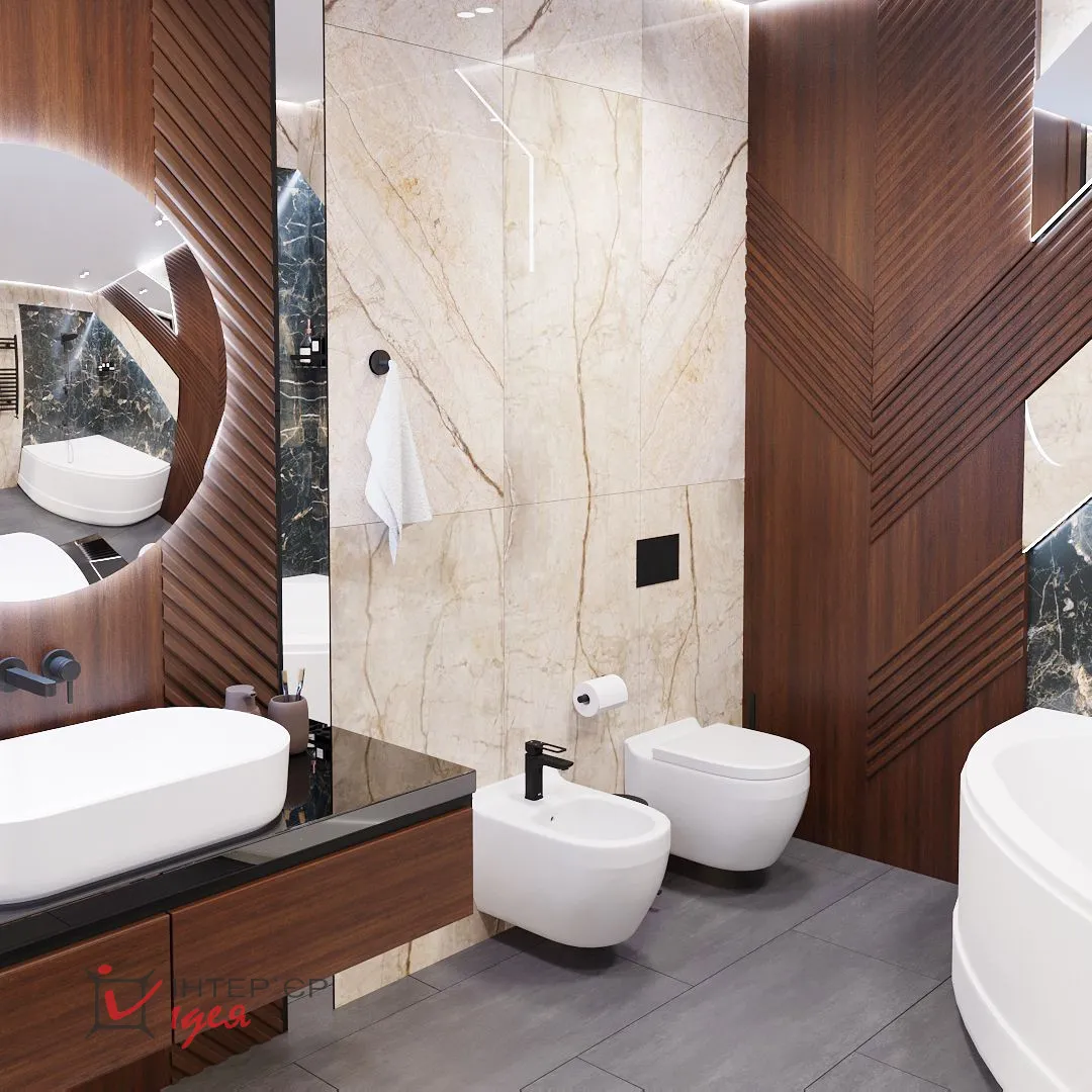 Напротив входа расположен умывальник с подвесной тумбой. В этой зоне использованы деревянные панели гладких и реечных фактур, зеркальные элементы и черное стекло. Удлиненные прямые линии дополняют округлые формы: круглое зеркало с подсветкой, подвесные светильники с небольшими шариками, овальная раковина, унитаз, биде и ванна.